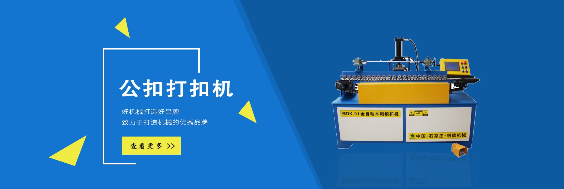 石家莊明德包裝機(jī)械有限公司是國(guó)內(nèi)專業(yè)生產(chǎn)木全自動(dòng)木箱鋼帶機(jī)、半自動(dòng)公母扣木箱打扣機(jī)、全自動(dòng)雙排孔定長(zhǎng)切斷機(jī)、美式托盤(pán)打釘機(jī)械、托盤(pán)刨槽機(jī)、倒角機(jī)、木包裝箱、木托盤(pán)的生產(chǎn)廠家。